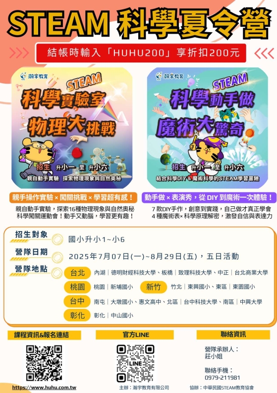 更多活動內容及梯次總表,請詳見附件,或搜尋「瀚宇教育冬夏令營」至報名網站https://reurl.cc/Nlo8A6 ,若需專人服務請洽詢活動方官方LINE。(LINE ID搜尋@camphuhu)