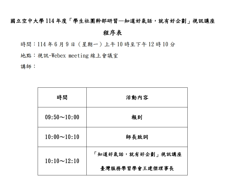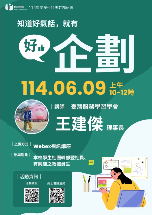 主旨:114年度「學生社團幹部研習—知道好氣話,就有好企劃」視訊講座,敬請惠予公告,並轉知所屬學務同仁、學生社團及有興趣之教職員生踴躍參加。