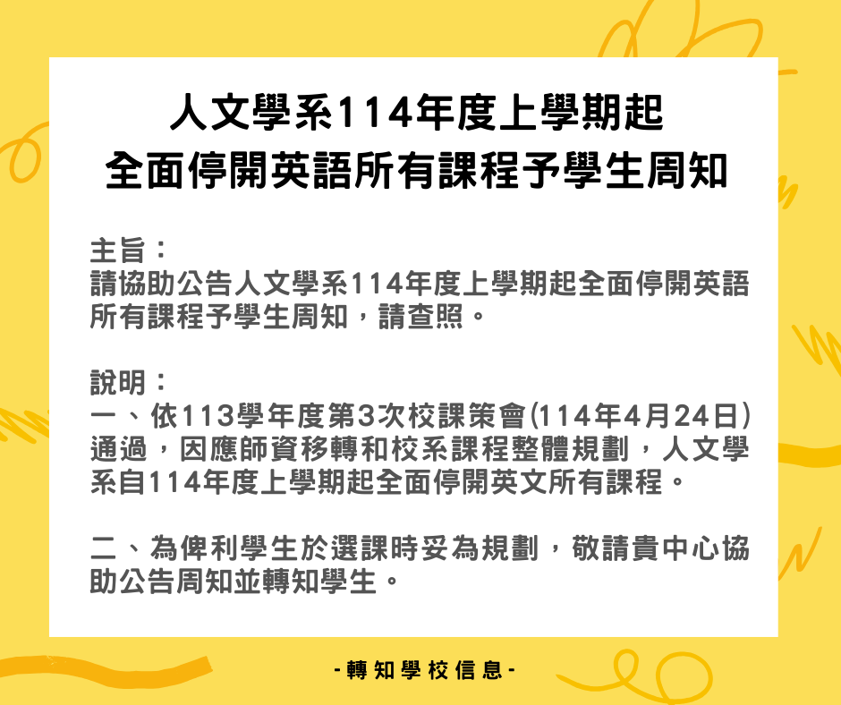 人文學系114年度上學期起全面停開英語所有課程予學生周知