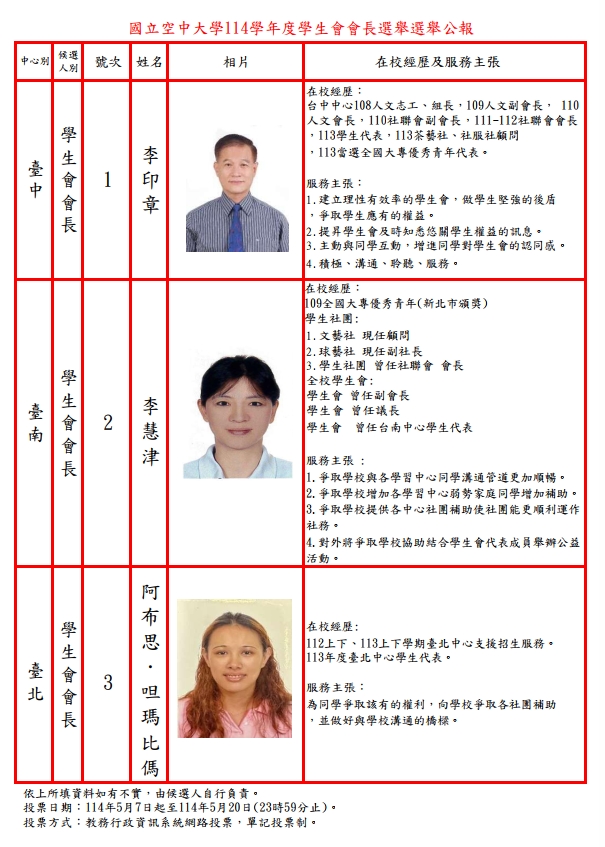 二、選舉人:為本學期有選課繳費之空大全修生及專科生(不含選修生), 同時兼具「空大全修生」及「專科生」雙重身分者,電腦設定為「空大全修生」身分上網投票。