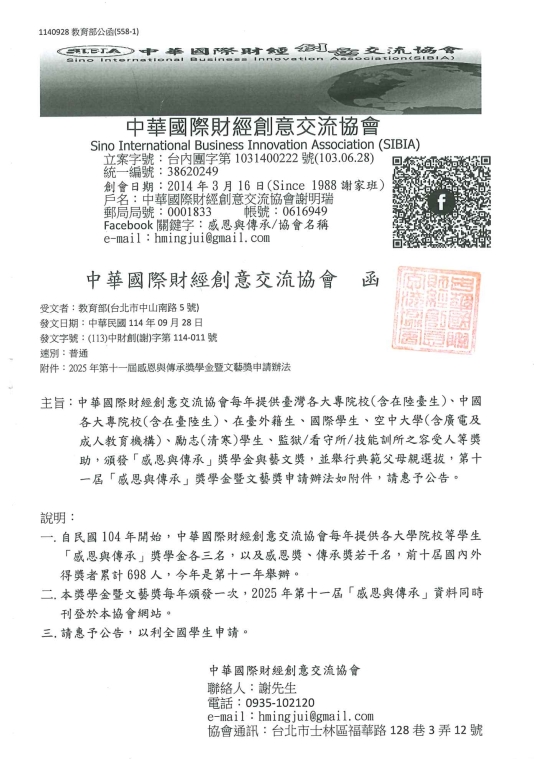 2025/10/21 中華國際財經創意交流協會2025年第11屆「感恩與傳承獎學金」暨藝文獎申請簡章