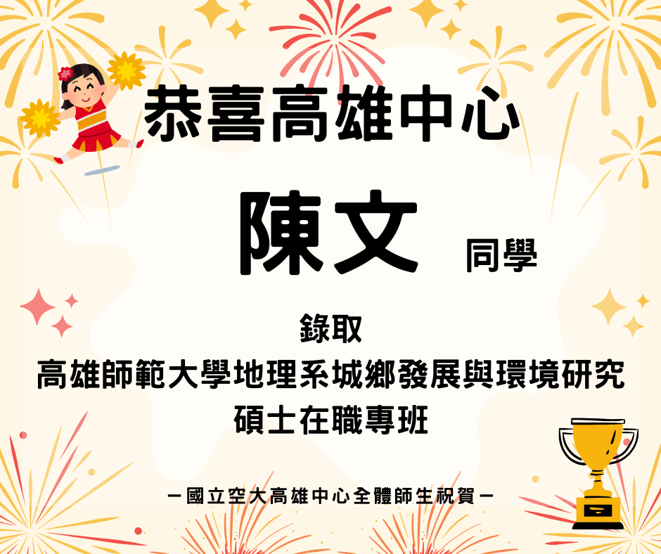 恭喜高雄中心陳文同學錄取高雄師範大學地理系 城鄉發展與環境研究碩士在職專班